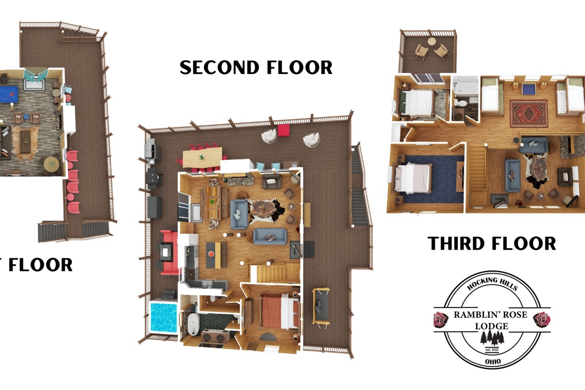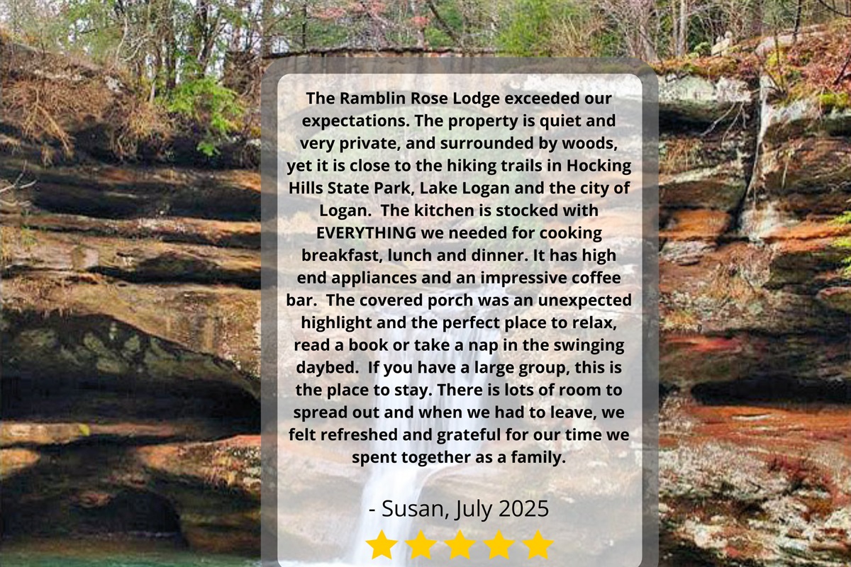 Escape to Ramblin Rose Lodge, a luxurious dog-welcoming cabin minutes from Hocking Hills best attractions. You'll enjoy this spacious cabin that features a large 2 story covered deck with hot tub, games, and 2 grills, ideal for lounging and dining after hiking the trails. Indoors, you'll love the chef's kitchen, amazing game room and comfortable spaces for the whole family. Ramblin Rose promises an unforgettable getaway you'll not soon forget!