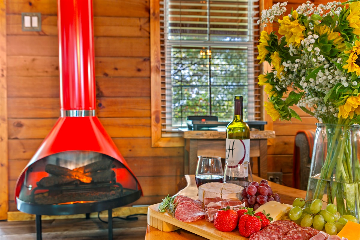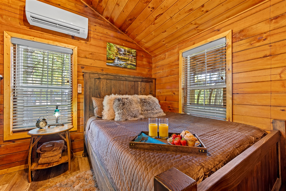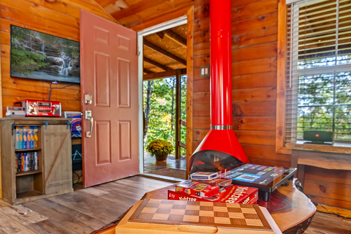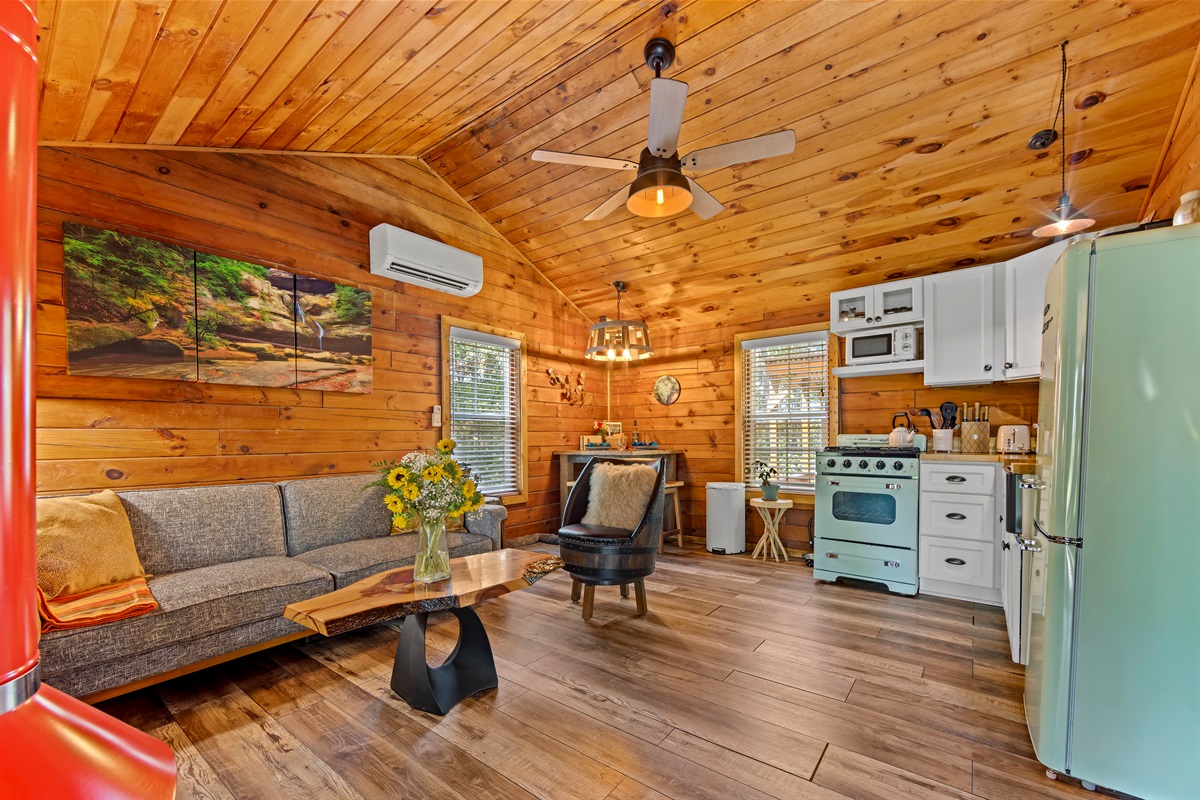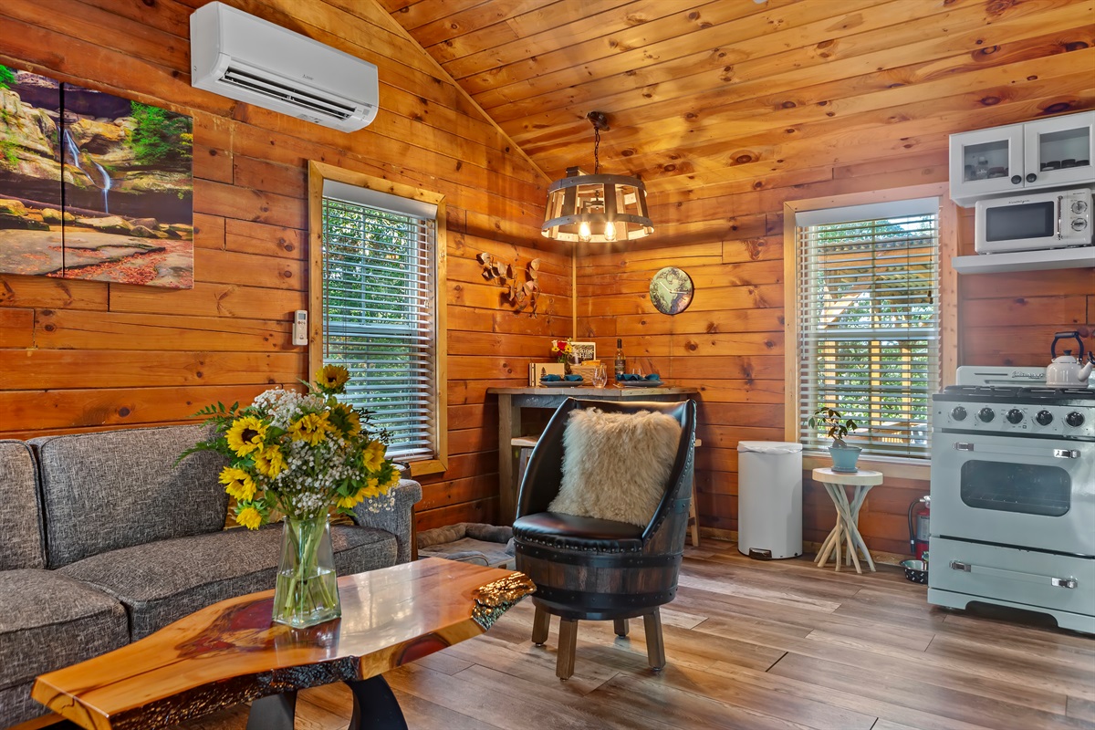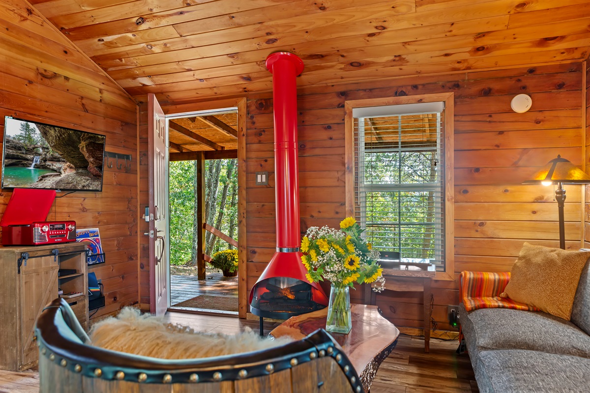Upon entering this newly renovated cabin, you will realize every area has been professionally decorated – from the electric mid-century modern fireplace, custom Amish furniture, high-end retro kitchen, and luxurious bedroom suite, each space offers amazing amenities! The open floorplan begins with a cozy living room and chef's kitchen with retro appliances. You'll appreciate the living room and bedroom each having a flat-screen TV (40" and 32") with YouTube TV along with a blazing fast 50-100mbps internet connection utilizing StarLink throughout the property.