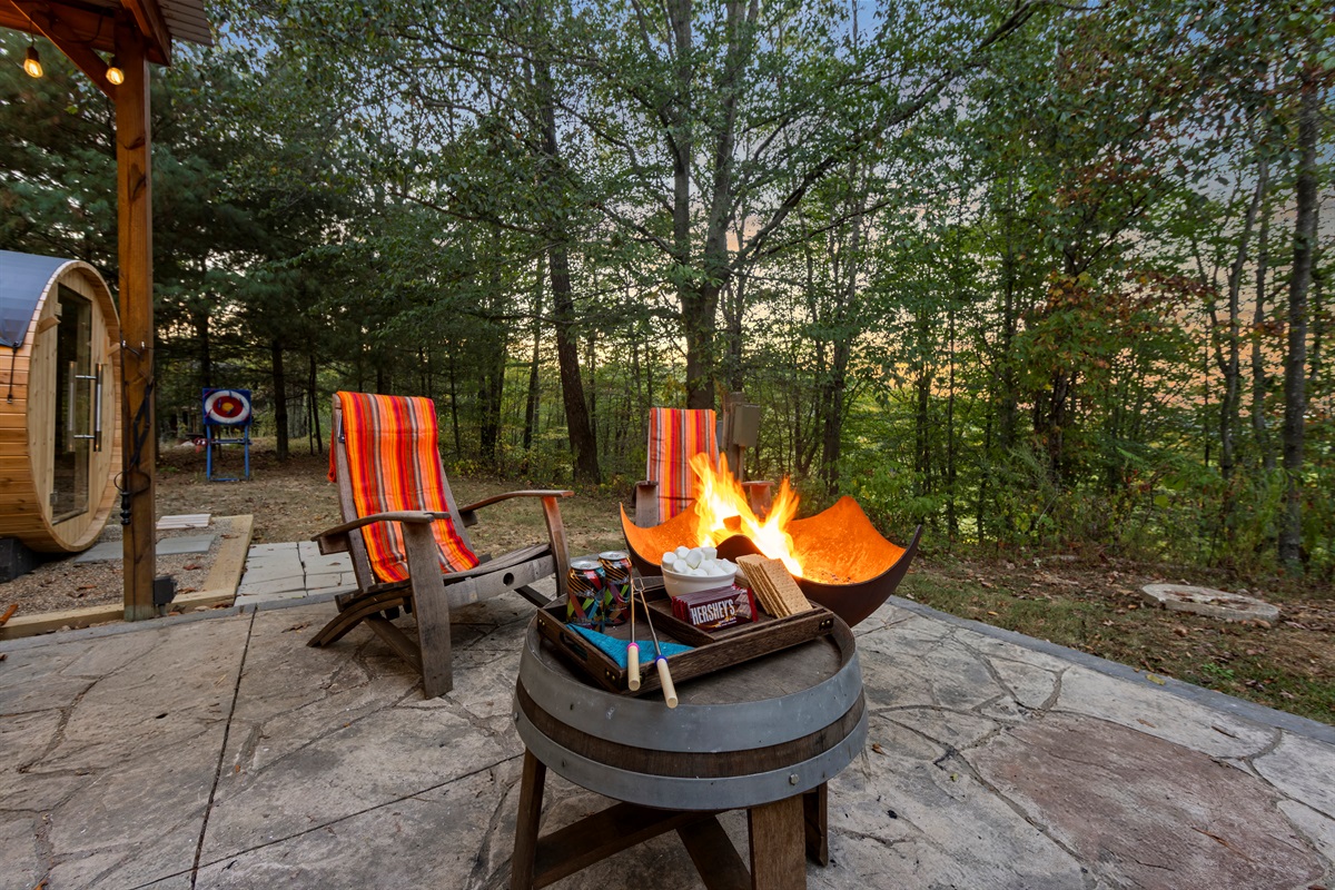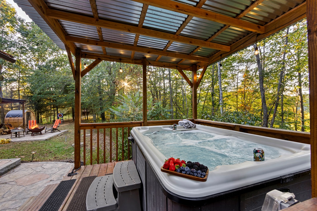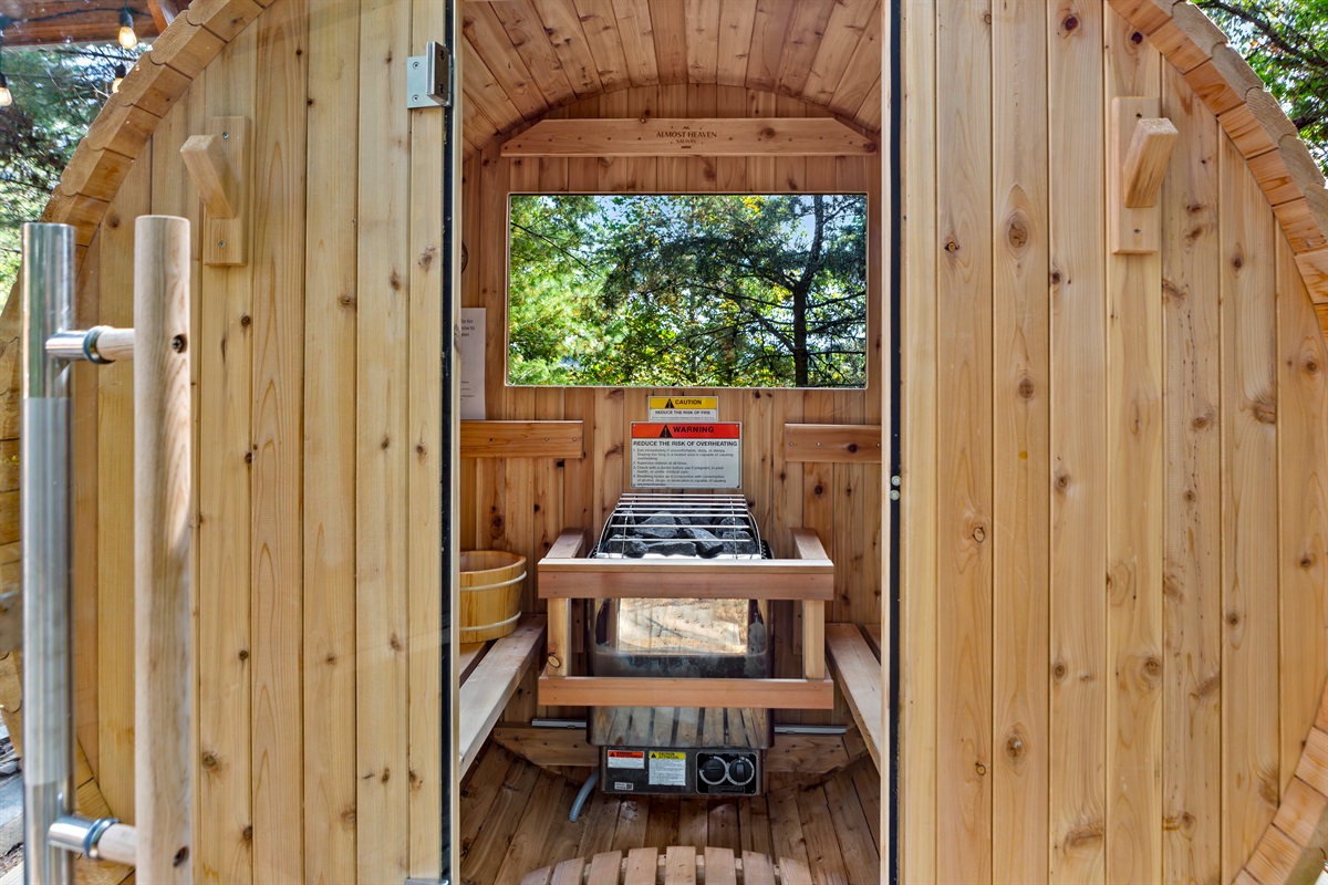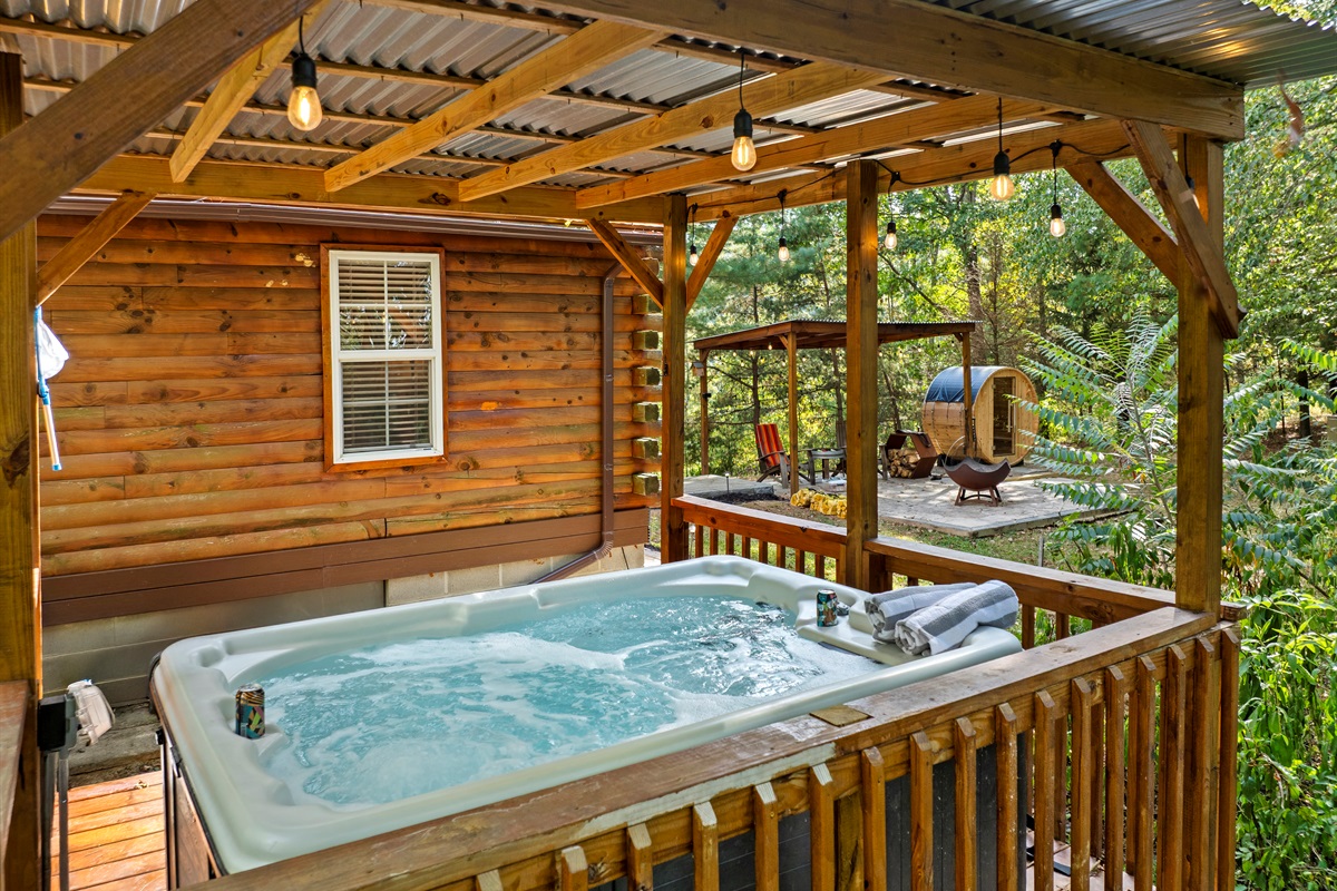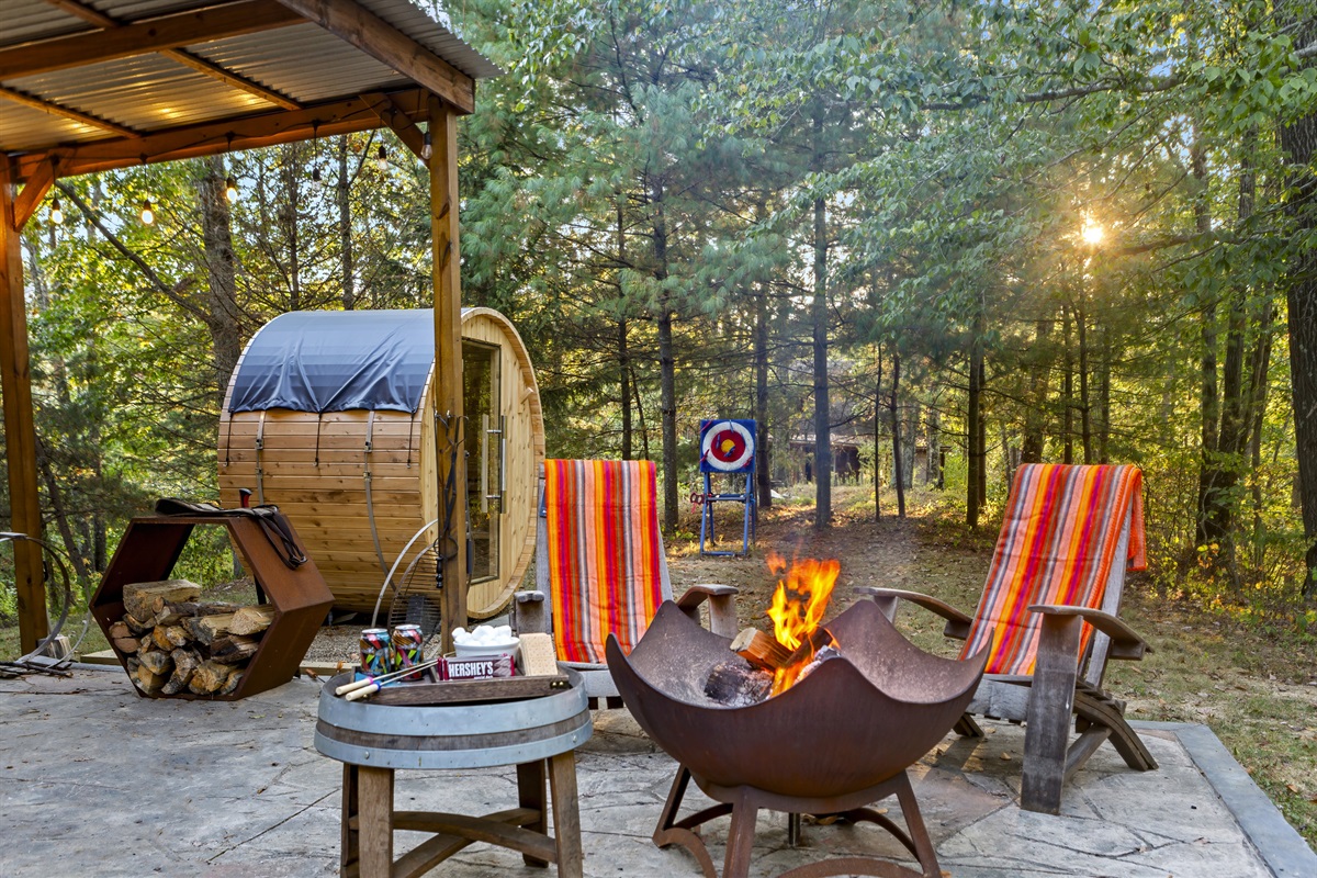 You’ll love spending time on the patio and deck, whether it be soaking in the hot tub overlooking the creek, cooking dinner on the Blackstone grill (propane provided), or just sitting down, relaxing and recapping the days adventures on the patio watching the sunset while toasting s'mores around the fire pit. You'll also enjoy the warmth and tranquility of the newly added 2-person barrel sauna If you're feeling on the more competitive side, challenge your partner to a game of cornhole with our custom cornhole boards or some ax and star throwing on the mesh throwing board.