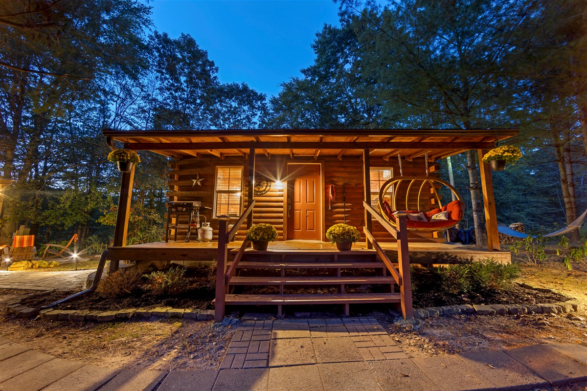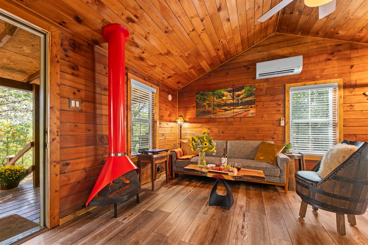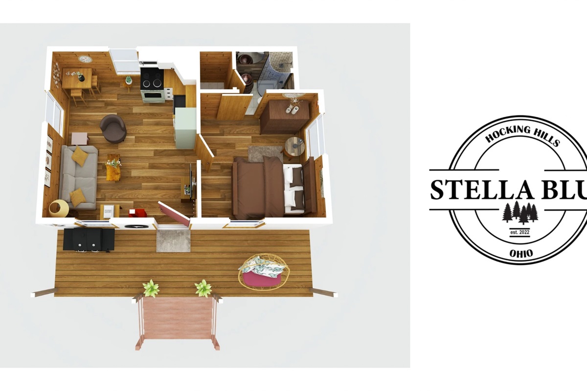 Perched atop a scenic ridge overlooking the creek below, Stella Blue is a newly renovated 1-bedroom, 1-bath tiny cabin that boasts big amenities. You'll love the retro mid-century modern decor accented with custom Amish furnishings throughout, making the space an amazing place to relax and disconnect. Spend the day exploring nearby state parks then return home where you'll cozy up next to the fire pit on the large covered patio and enjoy the sunset or relax in the hot tub situated on the deck overlooking the beautiful Hocking Hills.