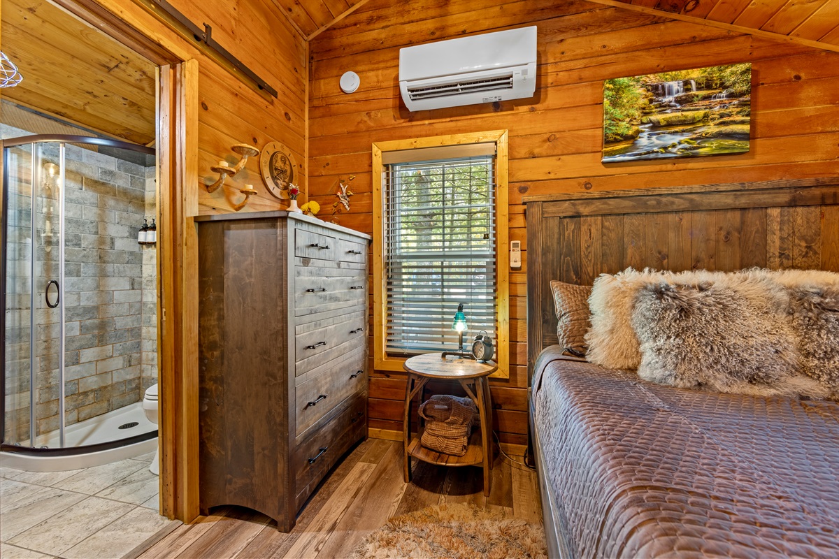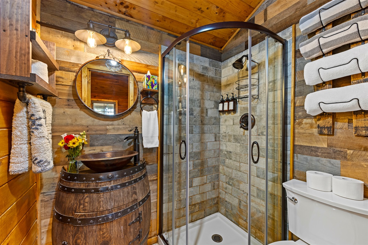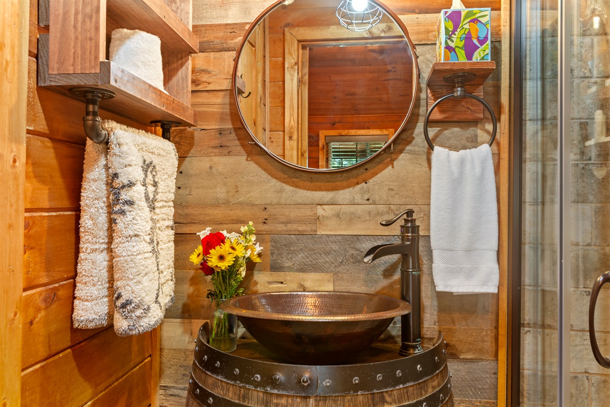 The bathroom provides a tiled shower and rustic copper barrel sink.
