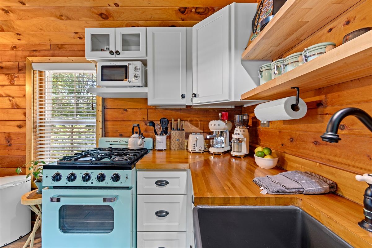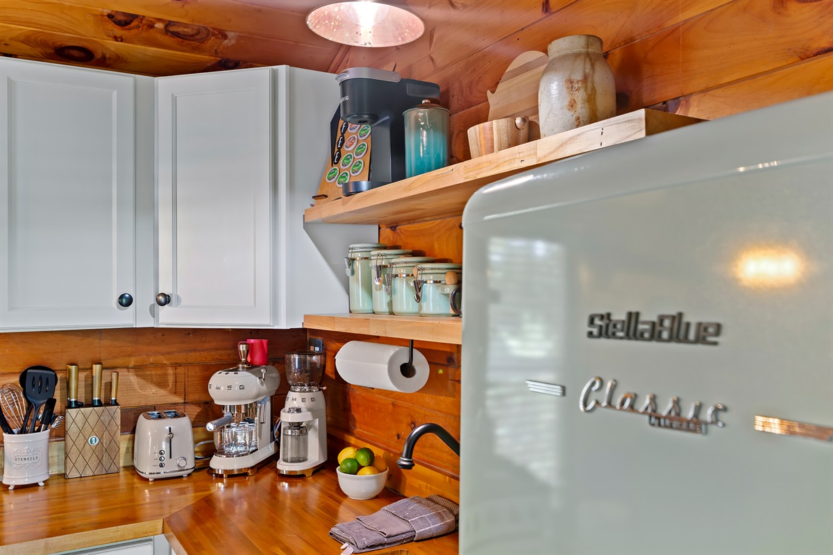 In the kitchen, you'll love the retro appliances and amazing cookware making every meal prep a pleasure. The coffee bar is unmatched with a bean grinder (coffee beans provided), espresso machine, and French press. A Keurig is also provided with a selection of pods as well as assorted teas and hot chocolate. You'll note that not an item was missed when appointing this kitchen making meal prep a breeze.