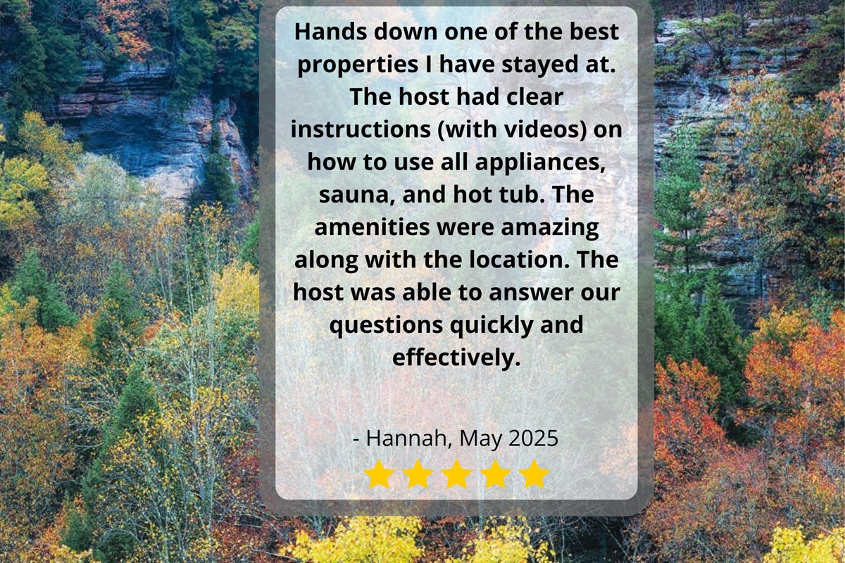 You’ll find uninterrupted serenity when you book Touch of Grey, a 4-bedroom, 2-bath Hocking Hills cabin crafted from hand-hewn logs. You’ll love the secluded yet central location, along with your own hot tub, sauna, and game room for endless on-site fun. Spend your days exploring Hocking Hills State Park, feeding your adrenaline with a zipline tour, or sampling local wine at Hocking Hills Winery — all just minutes away! Come evening, you can cozy up beside the fire pit, relax in the hot tub on the covered deck, or unwind in the luxurious sauna.